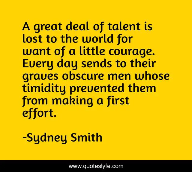 This page presents the quote "A great deal of talent is lost to the world for want of a little courage. Every day sends to their graves obscure men whose timidity prevented them from making a first effort.". Author of this quote is Sydney Smith. This quote is about world, great, day,.