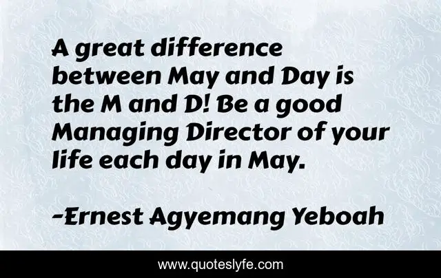 This page presents the quote "A great difference between May and Day is the M and D! Be a good Managing Director of your life each day in May.". Author of this quote is Ernest Agyemang Yeboah. This quote is about make-a-change, life, do-something-each-day, may, change-something, live-your-best-life, make-a-difference, time, wisdom,.