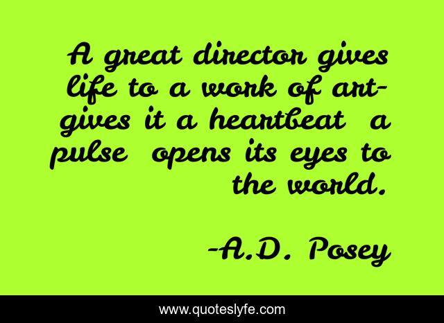 This page presents the quote "A great director gives life to a work of art- gives it a heartbeat… a pulse… opens its eyes to the world.". Author of this quote is A.D. Posey. This quote is about director, life, storytelling, world, opens-eyes, storytellers, heartbeat, story, pulse,.