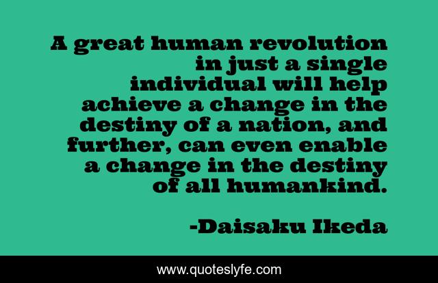This page presents the quote "A great human revolution in just a single individual will help achieve a change in the destiny of a nation, and further, can even enable a change in the destiny of all humankind.". Author of this quote is Daisaku Ikeda. This quote is about humankind, destiny, change, human-revolution,.