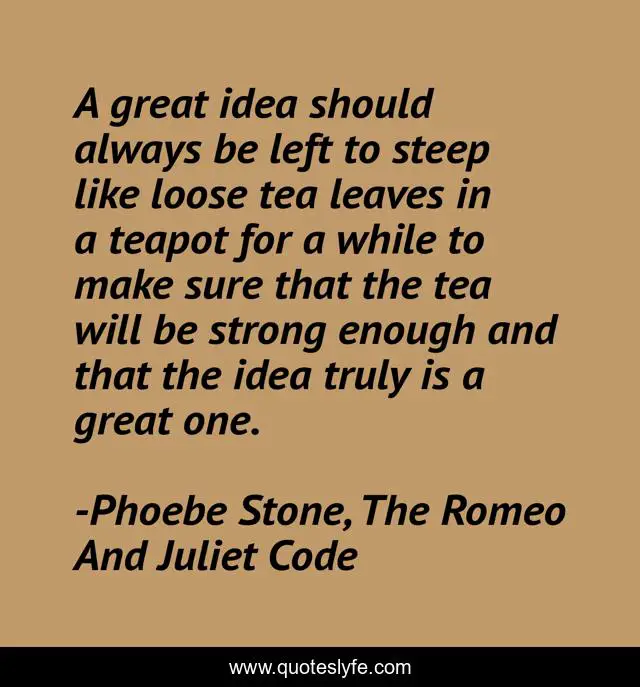 This page presents the quote "A great idea should always be left to steep like loose tea leaves in a teapot for a while to make sure that the tea will be strong enough and that the idea truly is a great one.". Author of this quote is Phoebe Stone, The Romeo And Juliet Code. This quote is about simile, ideas, thoughts, tea,.