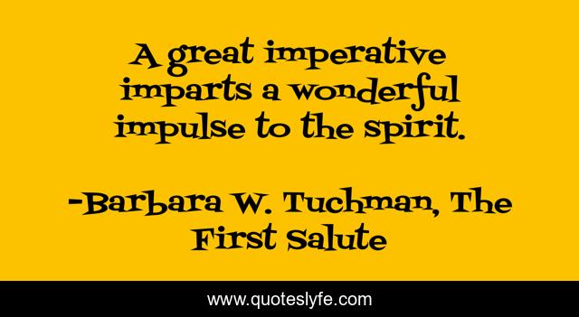This page presents the quote "A great imperative imparts a wonderful impulse to the spirit.". Author of this quote is Barbara W. Tuchman, The First Salute. This quote is about motivation, anxiety, self-sacrifice, goal-setting,.