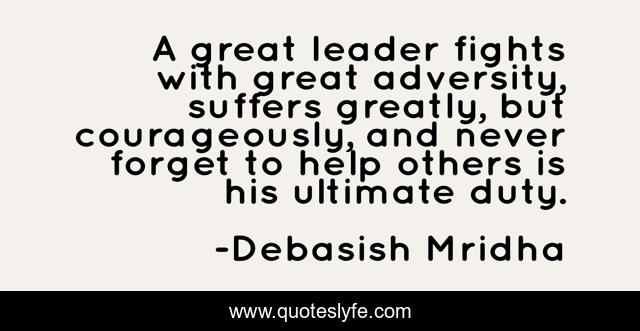 This page presents the quote "A great leader fights with great adversity, suffers greatly, but courageously, and never forget to help others is his ultimate duty.". Author of this quote is Debasish Mridha. This quote is about duty, love, forget, intelligence, education, happiness, help, suffer, knowledge,.
