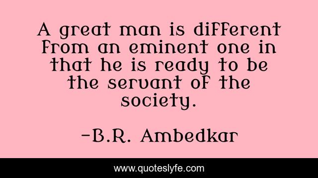 This page presents the quote "A great man is different from an eminent one in that he is ready to be the servant of the society.". Author of this quote is B.R. Ambedkar. This quote is about sociology, humanity-and-society,.
