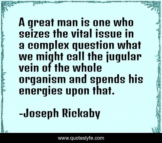 This page presents the quote "A great man is one who seizes the vital issue in a complex question what we might call the jugular vein of the whole organism and spends his energies upon that.". Author of this quote is Joseph Rickaby. .
