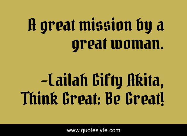 "Lailah Gifty Akita, Think Great: Be Great! Quotes." Quoteslyfe.com, 2025. Tue. 09 Dec. 2025. <https://www.quoteslyfe.com/quote/A-great-mission-by-a-great-woman-85487>.