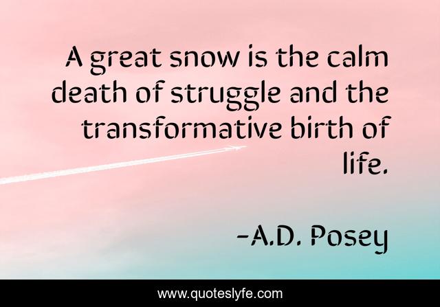 This page presents the quote "A great snow is the calm death of struggle and the transformative birth of life.". Author of this quote is A.D. Posey. This quote is about life, death, inspirational, storytelling, storytellers, great, snow, write, writers,.