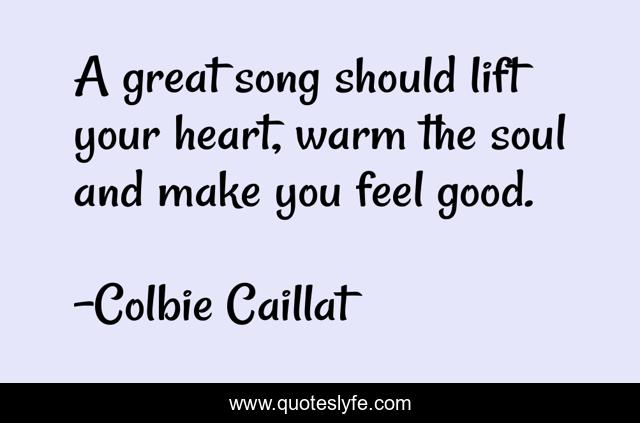 This page presents the quote "A great song should lift your heart, warm the soul and make you feel good.". Author of this quote is Colbie Caillat. This quote is about power-of-music, music, soul, song,.