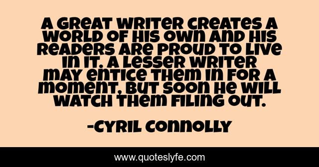 This page presents the quote "A great writer creates a world of his own and his readers are proud to live in it. A lesser writer may entice them in for a moment, but soon he will watch them filing out.". Author of this quote is Cyril Connolly. .