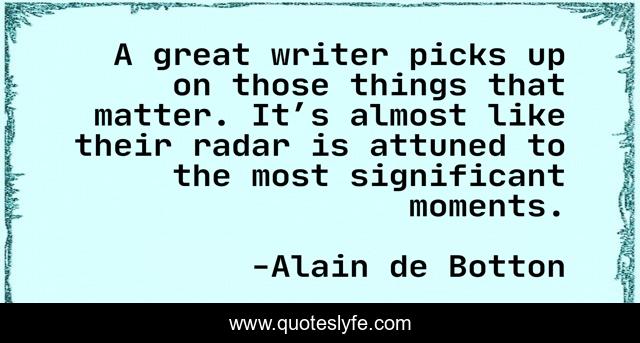 This page presents the quote "A great writer picks up on those things that matter. It’s almost like their radar is attuned to the most significant moments.". Author of this quote is Alain de Botton. This quote is about importance, writers-on-writing, writer, creativity, literature,.