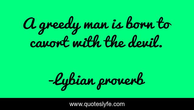 This page presents the quote "A greedy man is born to cavort with the devil.". Author of this quote is Lybian proverb. .