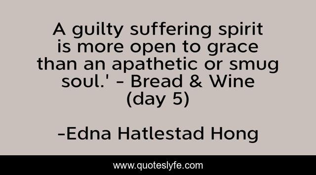 This page presents the quote "A guilty suffering spirit is more open to grace than an apathetic or smug soul.' - Bread & Wine (day 5)". Author of this quote is Edna Hatlestad Hong. This quote is about faith, grace, soul, christianity, guilt, lent, spirit,.