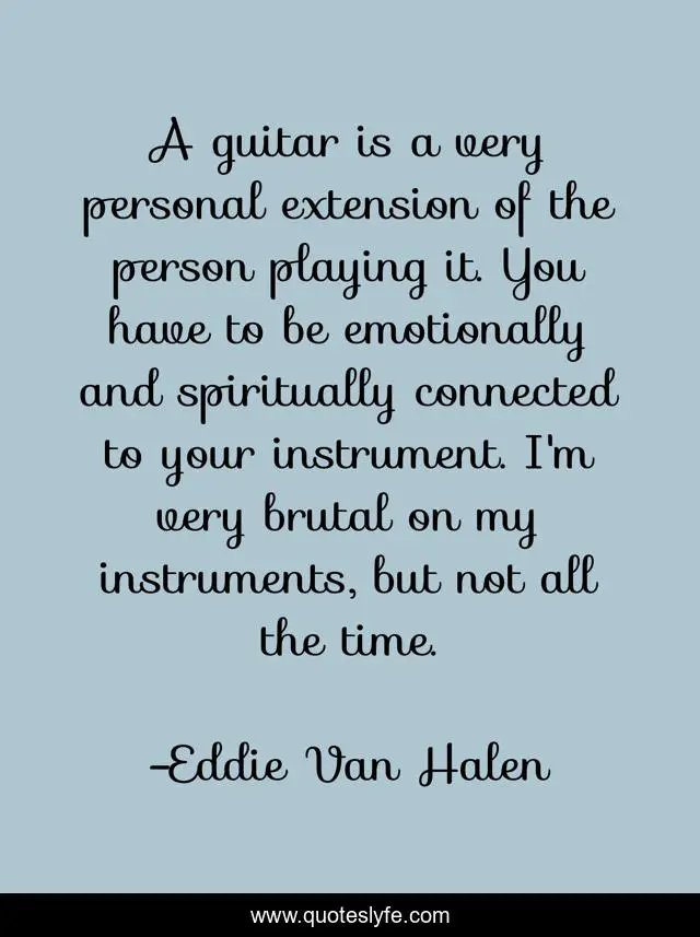 This page presents the quote "A guitar is a very personal extension of the person playing it. You have to be emotionally and spiritually connected to your instrument. I'm very brutal on my instruments, but not all the time.". Author of this quote is Eddie Van Halen. This quote is about guitar, personal,.