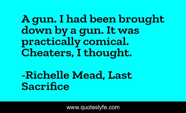 This page presents the quote "A gun. I had been brought down by a gun. It was practically comical. Cheaters, I thought.". Author of this quote is Richelle Mead, Last Sacrifice. This quote is about humor, rose-hathaway,.