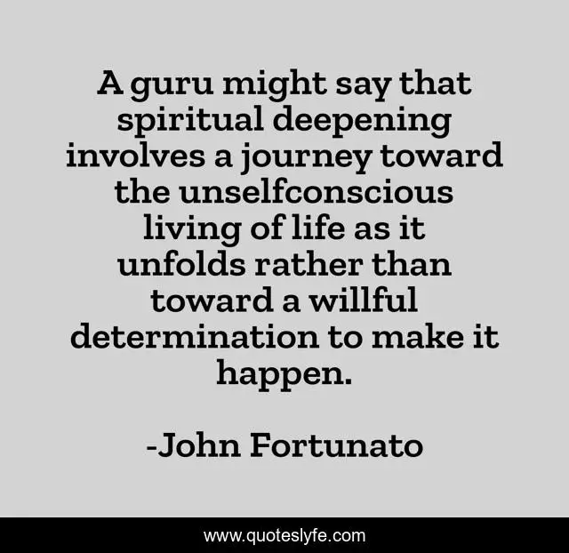 This page presents the quote "A guru might say that spiritual deepening involves a journey toward the unselfconscious living of life as it unfolds rather than toward a willful determination to make it happen.". Author of this quote is John Fortunato. .