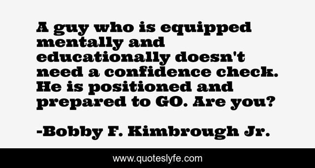 This page presents the quote "A guy who is equipped mentally and educationally doesn't need a confidence check. He is positioned and prepared to GO. Are you?". Author of this quote is Bobby F. Kimbrough Jr.. This quote is about motivation, strength, god, survival, midnight, spiritual, existence,.