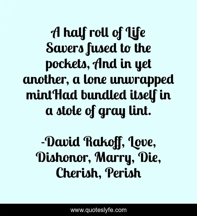 This page presents the quote "A half roll of Life Savers fused to the pockets, And in yet another, a lone unwrapped mintHad bundled itself in a stole of gray lint.". Author of this quote is David Rakoff, Love, Dishonor, Marry, Die, Cherish, Perish. .