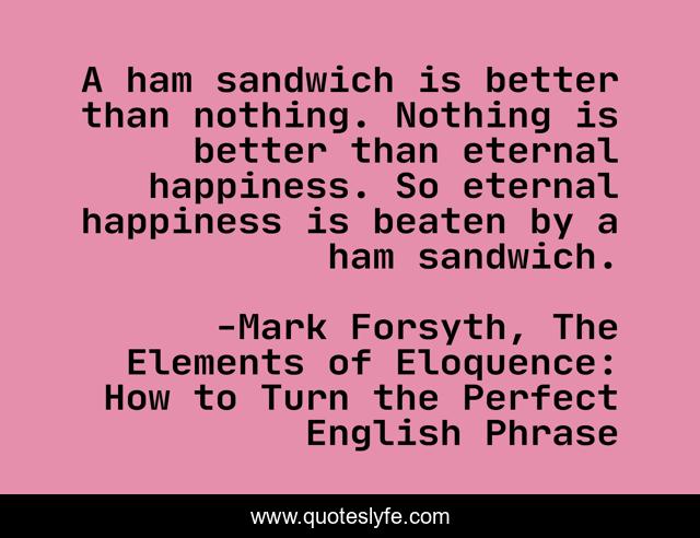 This page presents the quote "A ham sandwich is better than nothing. Nothing is better than eternal happiness. So eternal happiness is beaten by a ham sandwich.". Author of this quote is Mark Forsyth, The Elements of Eloquence: How to Turn the Perfect English Phrase. This quote is about food, funny, philosophy, comedy, language,.