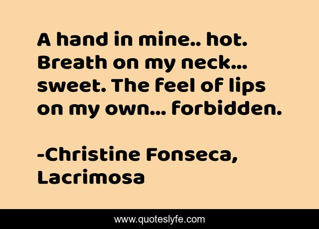 This page presents the quote "A hand in mine.. hot. Breath on my neck... sweet. The feel of lips on my own... forbidden.". Author of this quote is Christine Fonseca, Lacrimosa. This quote is about romance, ya, angels-and-demons,.