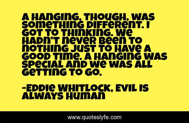 This page presents the quote "A hanging, though, was something different. I got to thinking. We hadn’t never been to nothing just to have a good time. A hanging was special and we was all getting to go.". Author of this quote is Eddie Whitlock, Evil Is Always Human. This quote is about execution, murder, evil, hanging,.