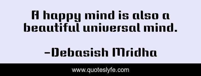 This page presents the quote "A happy mind is also a beautiful universal mind.". Author of this quote is Debasish Mridha. This quote is about beautiful, life, love, knowledge, beauty, inspirational, intelligence, universal, philosophy,.