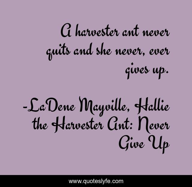 "LaDene Mayville, Hallie the Harvester Ant: Never Give Up Quotes." Quoteslyfe.com, 2025. Mon. 08 Dec. 2025. <https://www.quoteslyfe.com/quote/A-harvester-ant-never-quits-and-she-100063>.