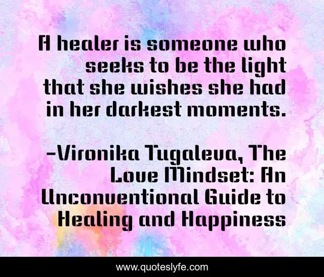 This page presents the quote "A healer is someone who seeks to be the light that she wishes she had in her darkest moments.". Author of this quote is Vironika Tugaleva, The Love Mindset: An Unconventional Guide to Healing and Happiness. This quote is about love, help, wisdom, healing, helping-others, healer, affection,.