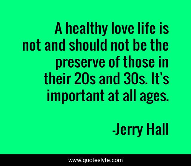 This page presents the quote "A healthy love life is not and should not be the preserve of those in their 20s and 30s. It's important at all ages.". Author of this quote is Jerry Hall. This quote is about life, love, affection, love life,.