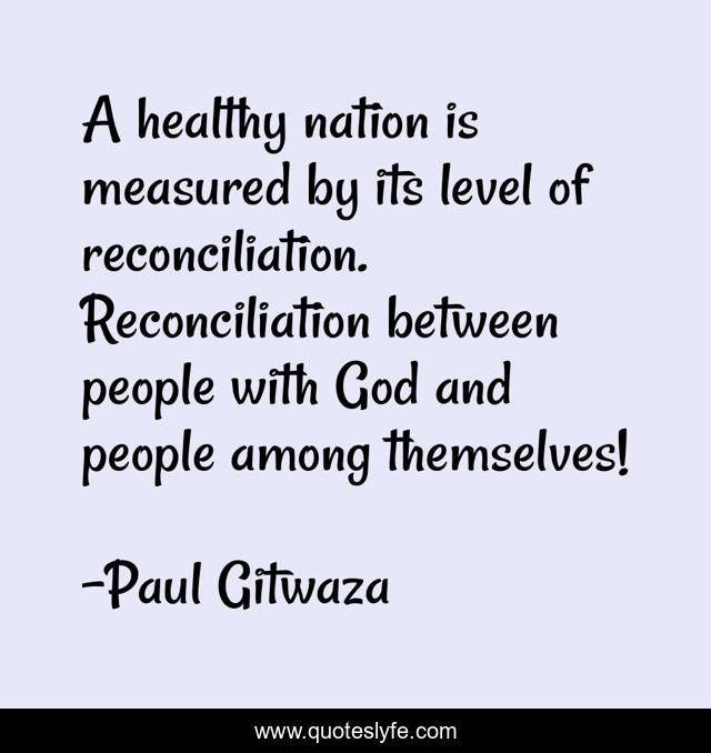 This page presents the quote "A healthy nation is measured by its level of reconciliation. Reconciliation between people with God and people among themselves!". Author of this quote is Paul Gitwaza. This quote is about god, country, reconciliation, healthy-living, people,.