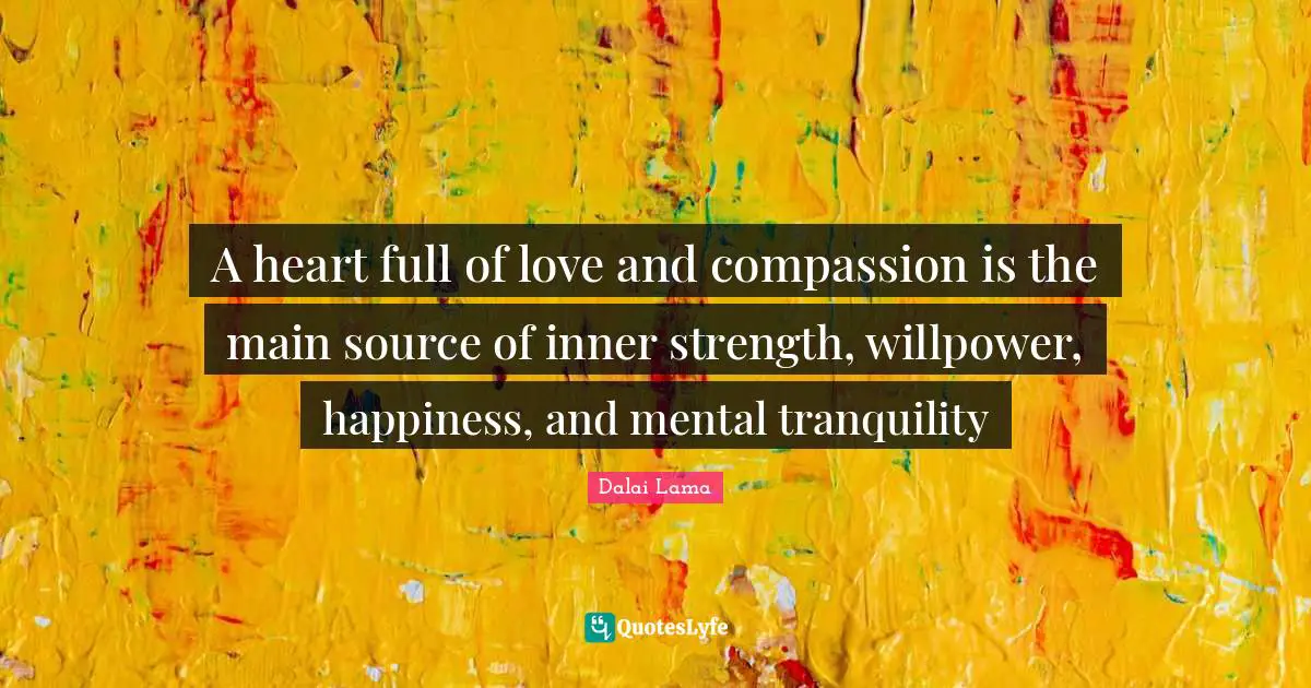 This page presents the quote "A heart full of love and compassion is the main source of inner strength, willpower, happiness, and mental tranquility". Author of this quote is Dalai Lama. This quote is about source, inner strength, heart full of love, tranquility, compassion, happiness, willpower, heart,.