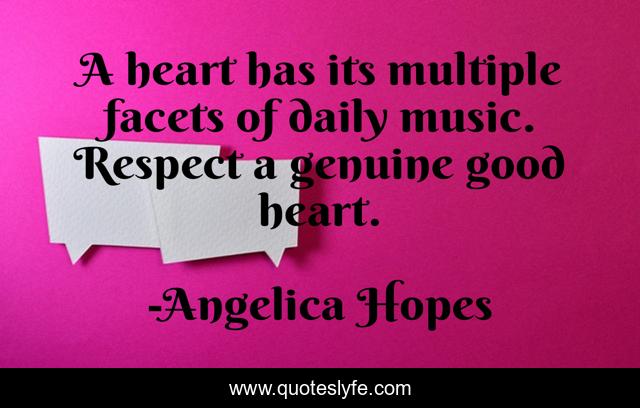 This page presents the quote "A heart has its multiple facets of daily music. Respect a genuine good heart.". Author of this quote is Angelica Hopes. This quote is about heart, reality, landscapes-of-a-heart, respect, whispers-of-a-soul,.