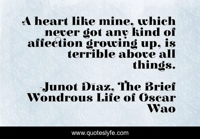 This page presents the quote "A heart like mine, which never got any kind of affection growing up, is terrible above all things.". Author of this quote is Junot Díaz, The Brief Wondrous Life of Oscar Wao. This quote is about heart, affection,.