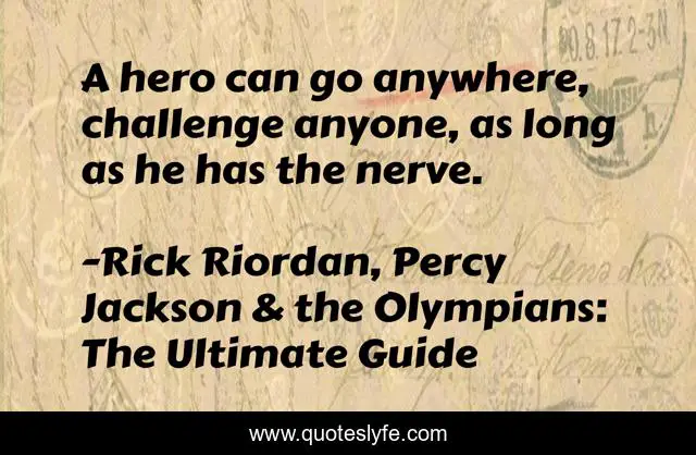 This page presents the quote "A hero can go anywhere, challenge anyone, as long as he has the nerve.". Author of this quote is Rick Riordan, Percy Jackson & the Olympians: The Ultimate Guide. This quote is about hero, chiron, rick-riordan, ultimate-guide, percy-jackson-and-the-olympians, best,.