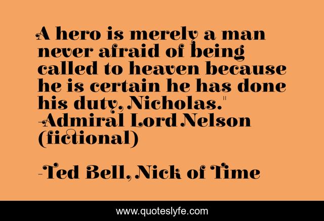 This page presents the quote "A hero is merely a man never afraid of being called to heaven because he is certain he has done his duty, Nicholas." -Admiral Lord Nelson (fictional)". Author of this quote is Ted Bell, Nick of Time. This quote is about duty, heroes,.