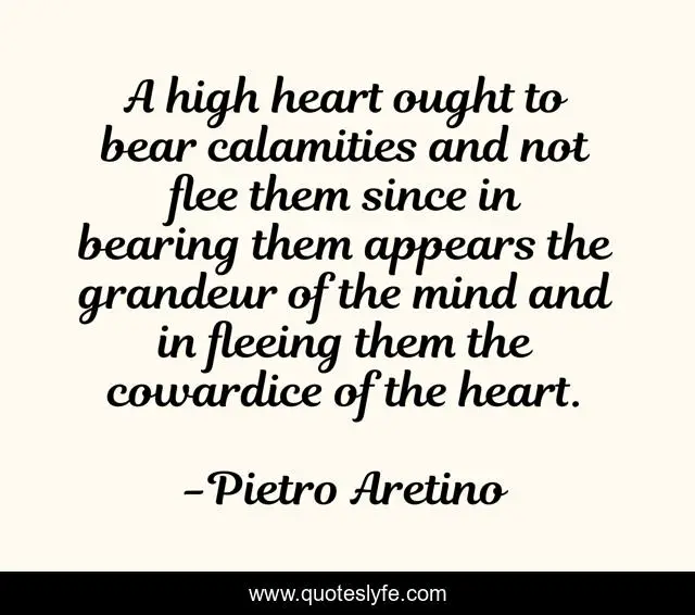 This page presents the quote "A high heart ought to bear calamities and not flee them since in bearing them appears the grandeur of the mind and in fleeing them the cowardice of the heart.". Author of this quote is Pietro Aretino. This quote is about , pressure, diamonds,.