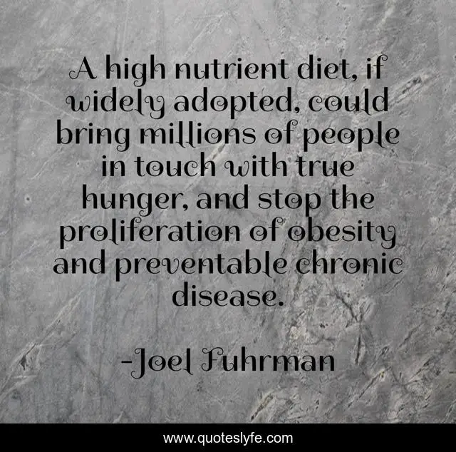 This page presents the quote "A high nutrient diet, if widely adopted, could bring millions of people in touch with true hunger, and stop the proliferation of obesity and preventable chronic disease.". Author of this quote is Joel Fuhrman. This quote is about obesity, true, people,.
