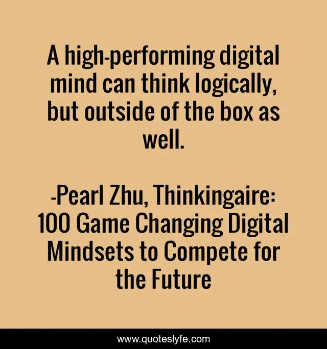 This page presents the quote "A high-performing digital mind can think logically, but outside of the box as well.". Author of this quote is Pearl Zhu, Thinkingaire: 100 Game Changing Digital Mindsets to Compete for the Future. This quote is about thinking, digital-mind, creativity, out-of-the-box,.