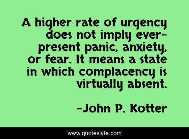 This page presents the quote "A higher rate of urgency does not imply ever-present panic, anxiety, or fear. It means a state in which complacency is virtually absent.". Author of this quote is John P. Kotter. This quote is about anxiety, complacency,.