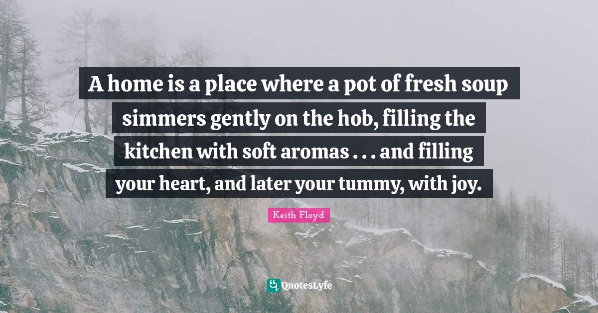 This page presents the quote "A home is a place where a pot of fresh soup simmers gently on the hob, filling the kitchen with soft aromas . . . and filling your heart, and later your tummy, with joy.". Author of this quote is Keith Floyd. This quote is about home, joy, pot, filling, soup, kitchen, heart,.