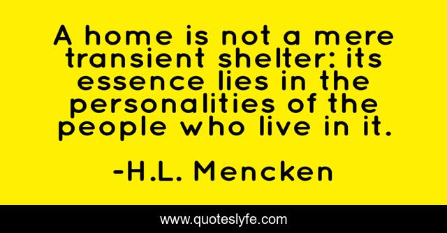 This page presents the quote "A home is not a mere transient shelter: its essence lies in the personalities of the people who live in it.". Author of this quote is H.L. Mencken. This quote is about shelter, home, house,.