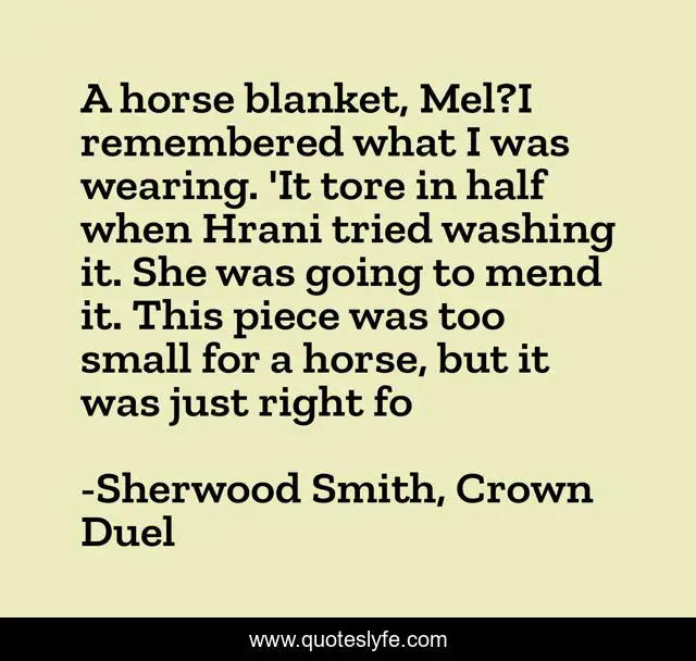 "Sherwood Smith, Crown Duel Quotes." Quoteslyfe.com, 2025. Mon. 08 Dec. 2025. <https://www.quoteslyfe.com/quote/A-horse-blanket-Mel-I-remembered-what-40947>.