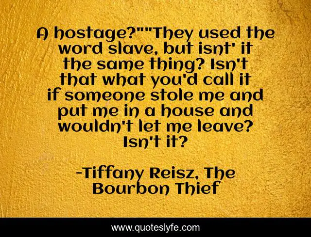 This page presents the quote "A hostage?""They used the word slave, but isnt' it the same thing? Isn't that what you'd call it if someone stole me and put me in a house and wouldn't let me leave? Isn't it?". Author of this quote is Tiffany Reisz, The Bourbon Thief. This quote is about slavery, slavery-history,.