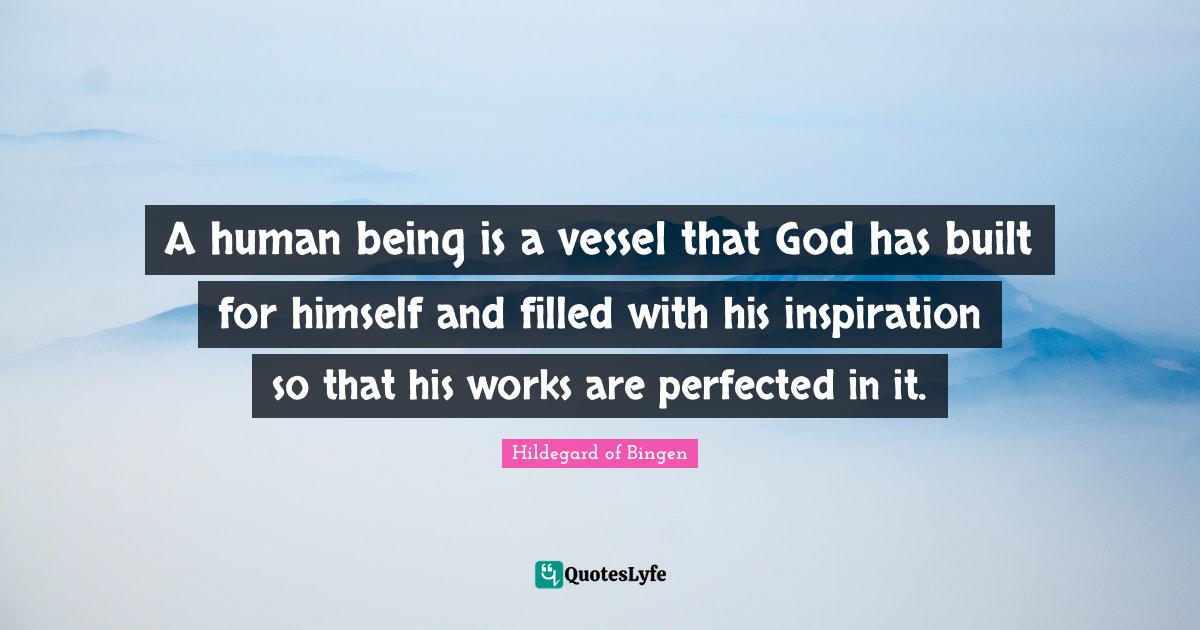 This page presents the quote "A human being is a vessel that God has built for himself and filled with his inspiration so that his works are perfected in it.". Author of this quote is Hildegard of Bingen. This quote is about filled, built, humans, god, vessel, inspiration,.