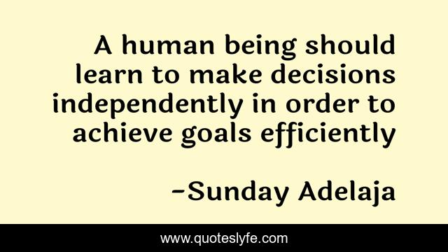 This page presents the quote "A human being should learn to make decisions independently in order to achieve goals efficiently". Author of this quote is Sunday Adelaja. This quote is about independently, goal, decisions, make, life, calling, purpose, learn, human-being,.