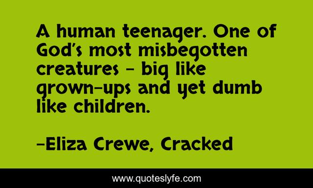 This page presents the quote "A human teenager. One of God’s most misbegotten creatures – big like grown-ups and yet dumb like children.". Author of this quote is Eliza Crewe, Cracked. This quote is about teenager, teenagers,.