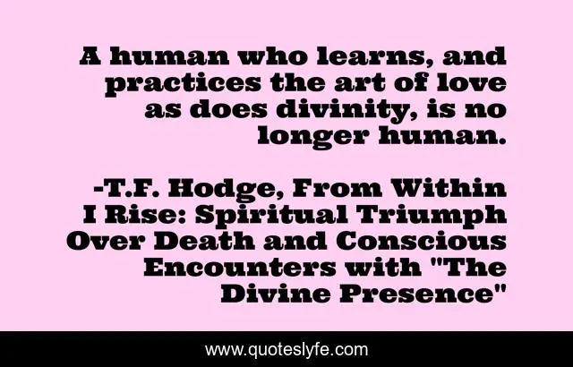 This page presents the quote "A human who learns, and practices the art of love as does divinity, is no longer human.". Author of this quote is T.F. Hodge, From Within I Rise: Spiritual Triumph Over Death and Conscious Encounters with "The Divine Presence". This quote is about love, practice, human, learn, art, divine, humanity, affection, divinity,.