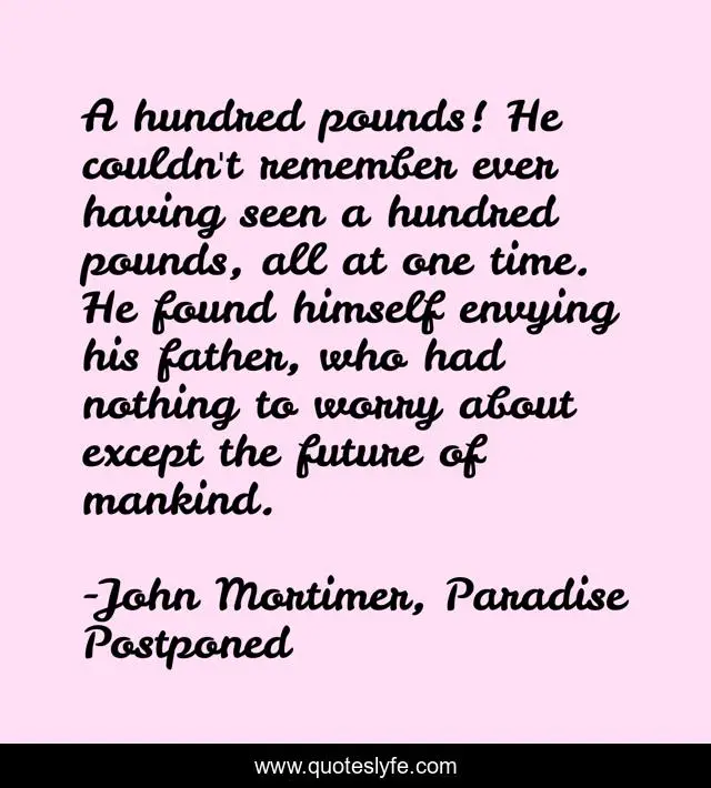 This page presents the quote "A hundred pounds! He couldn't remember ever having seen a hundred pounds, all at one time. He found himself envying his father, who had nothing to worry about except the future of mankind.". Author of this quote is John Mortimer, Paradise Postponed. .