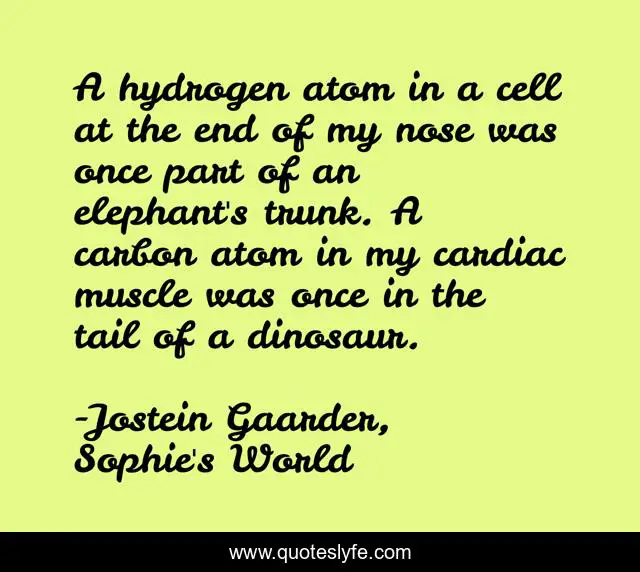 This page presents the quote "A hydrogen atom in a cell at the end of my nose was once part of an elephant's trunk. A carbon atom in my cardiac muscle was once in the tail of a dinosaur.". Author of this quote is Jostein Gaarder, Sophie's World. This quote is about evolution, philosophy, oneness,.