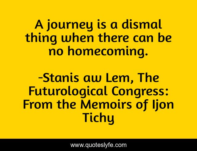 This page presents the quote "A journey is a dismal thing when there can be no homecoming.". Author of this quote is Stanisław Lem, The Futurological Congress: From the Memoirs of Ijon Tichy. This quote is about home, journey,.