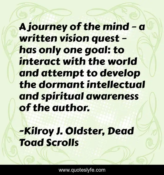 This page presents the quote "A journey of the mind – a written vision quest – has only one goal: to interact with the world and attempt to develop the dormant intellectual and spiritual awareness of the author.". Author of this quote is Kilroy J. Oldster, Dead Toad Scrolls. This quote is about spiritual-growth, memoir, awareness, intellectual, writing,.